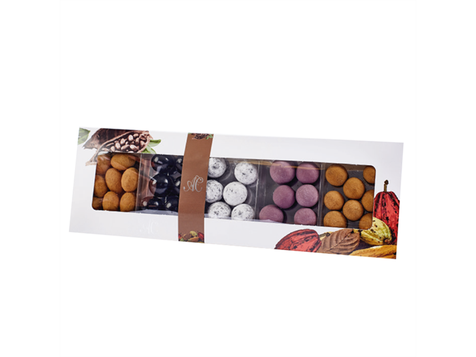 Ingredienser: Sukker, Sirup, Kakaosmør, Mandler (9,9%), Mælkepulver, Majsmel, Lakridspulver, Invert. sukkersirup, Lakrids glutenfri (0,6%), Salt, Overfladebehandlingsmiddel (kokosolie, E903), Stabilisator (E414, E420), Konservering (E200, E202, E290), Aroma, Emulgator (sojalecithin), Glukosesirup, Kakaomasse, Farve (E153, E171), Naturlig aroma (vanilje), Surhedsregulator (citronsyre), Kakaopulver, Vegetabilsk fedt (palme, raps), Hvedestivelse, Mælkeproteiner.