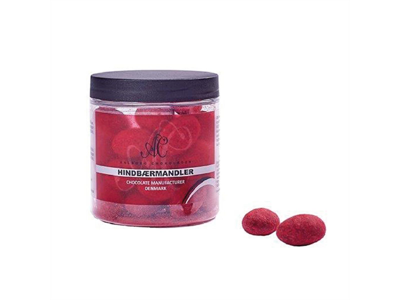 Ingredienser: Chokolade, min. 33,6% kakaotørstof (43,5%): Sukker, kakaosmør, sødmælkspulver, kakaomasse, emulgator (Sojalecithin), naturlig vanilje aroma., Mandler (43,5%), frysetørret hindbær (13%).