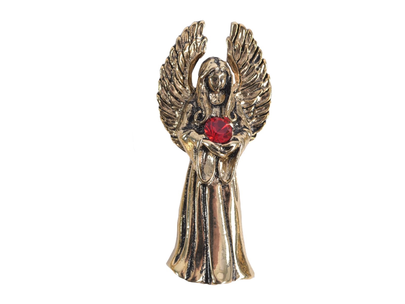 Skytsenglen er belagt med 24 karat guld – sidder flot og diskret å jakken eller trøjen. Venskabets Engel holder en mørkerød zirkonia sten.