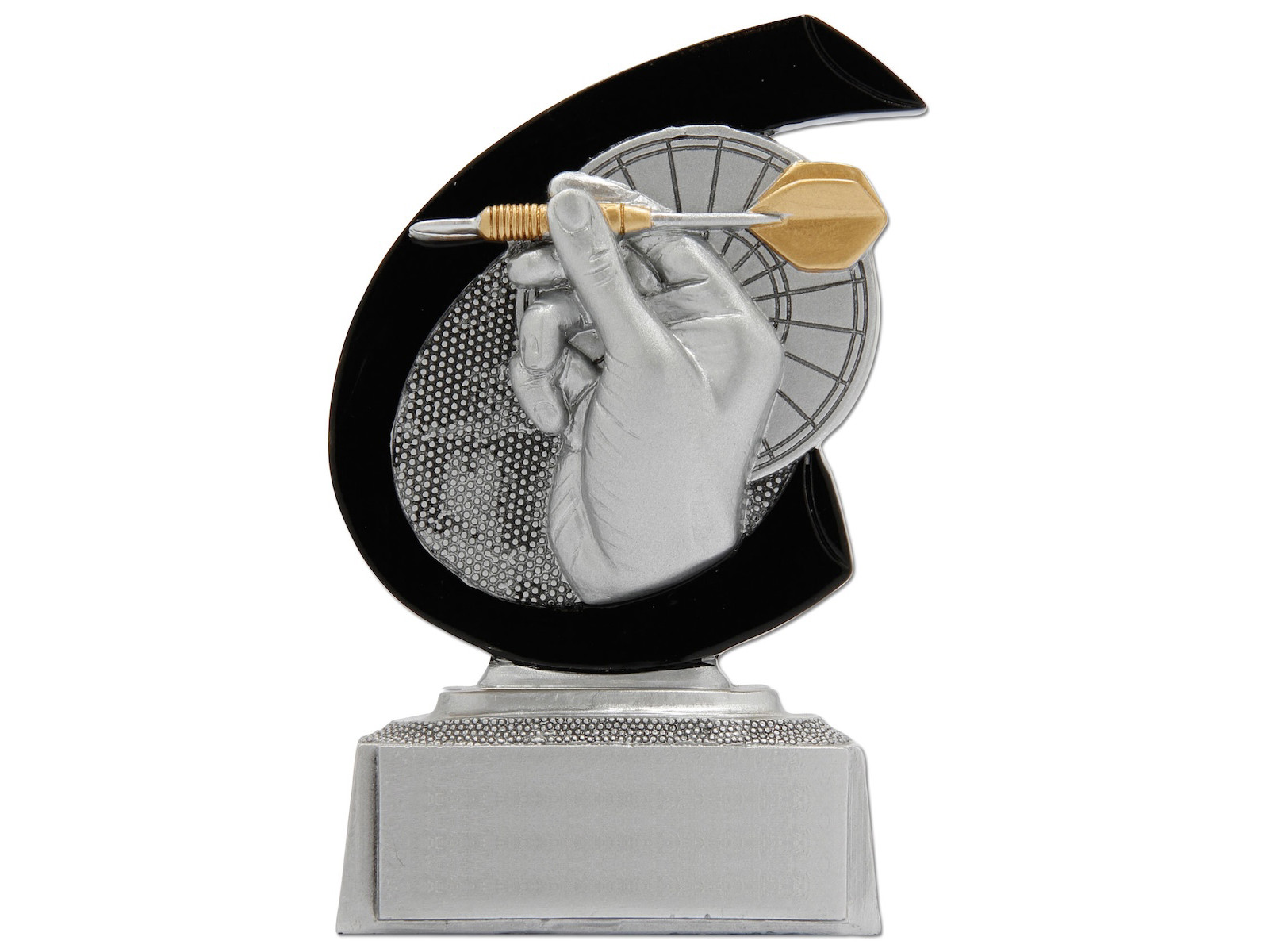 Flot statuette målrettet dart. Statuetten er sølvfarvet, men har sorte og gyldne detaljer. Der er afbilledet en hånd med en dartpil. Brug statuetten som deltagerpræmie eller til den bedste spiller.