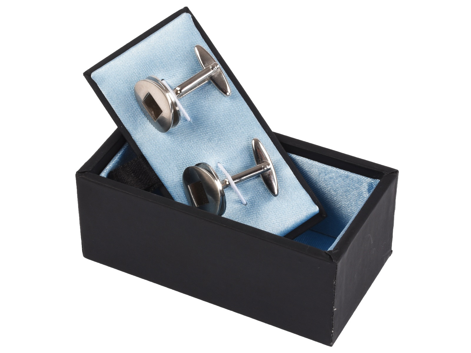 Denne æske er perfekt til manchetknapper. Den er fremstillet i sort pap, og indersiden er beklædt med lyseblåt stof. I låget er der monteret to elastikker, en til hver manchetknap. Æskens opbygning gør at låget kan vendes om, så manchetknapperne bliver vist frem på en elegant måde.