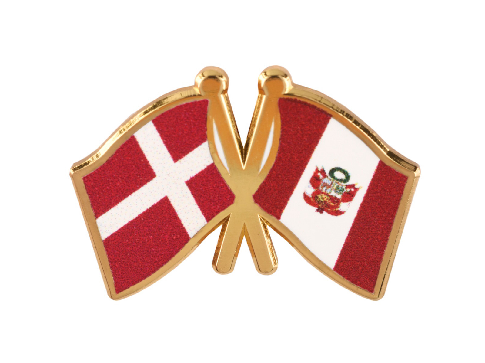 Vis den særlige relation til Peru med statsflag. Dette venskabsflag har både det danske og Perus statsflag; hvor landets våbenskjold er vist.