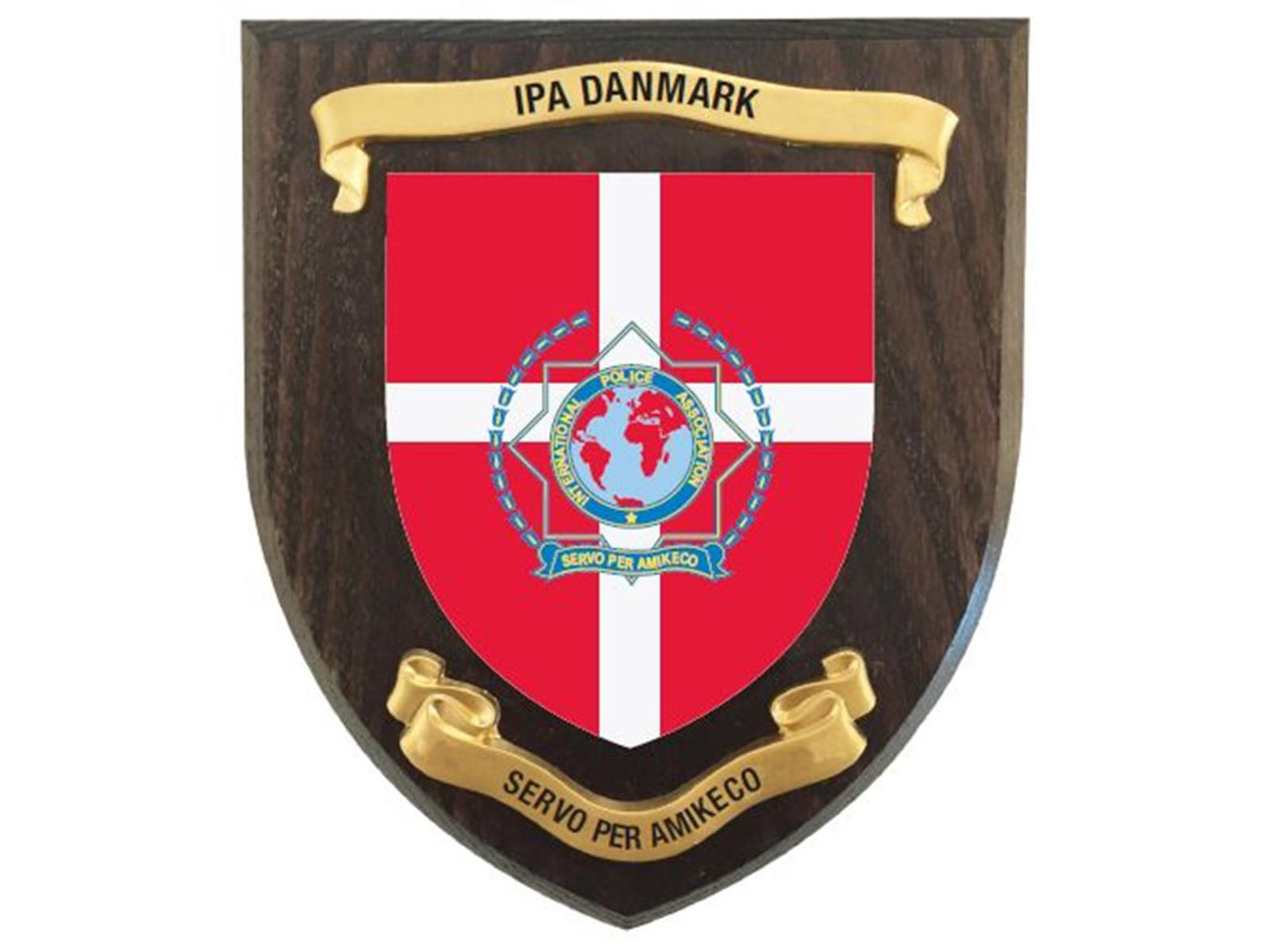 Flot skjold i mørkt træ med International Police Association logo ovenpå det danske flag. Skoldet vil hænge flot i stuen eller på kontoret og er en ideel gave, hvis du vil takke et medlem af IPA.