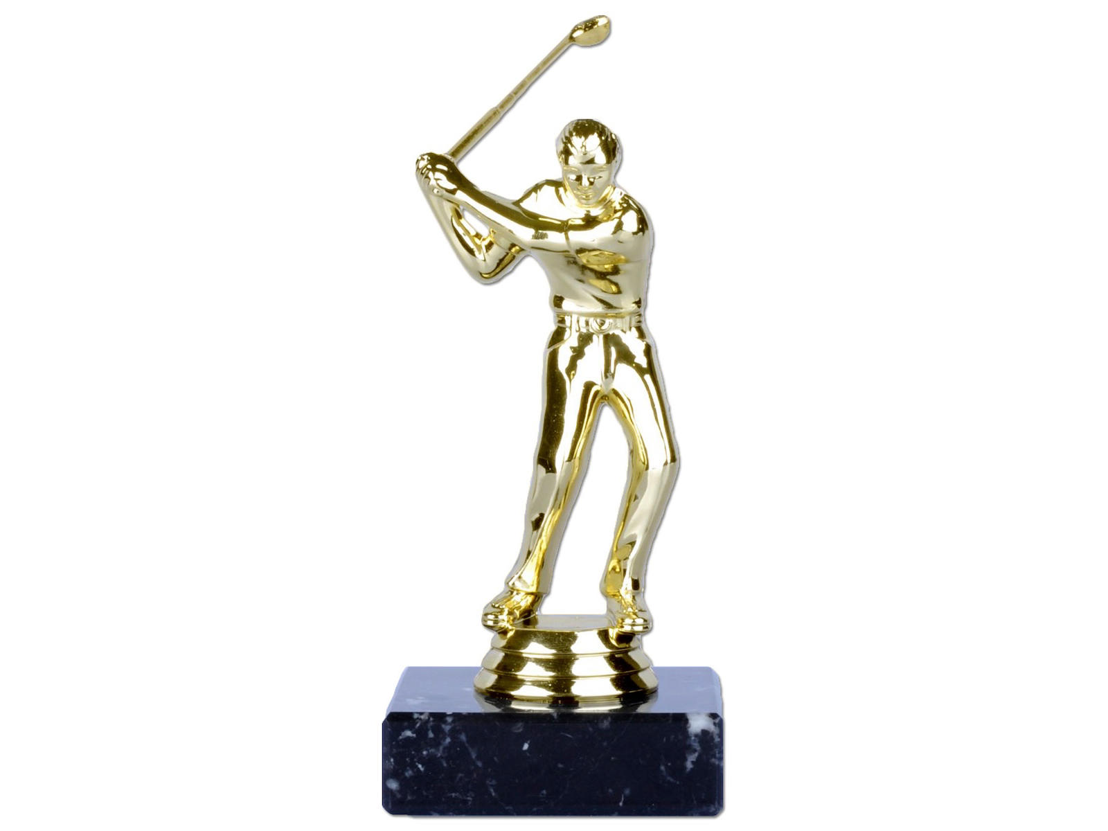 Flot forgyldt golfspiller på en mørk marmorsokkel. Denne figur forestiller en mandlig golfspiller og er den ideelle præmie til næste golfturnering.