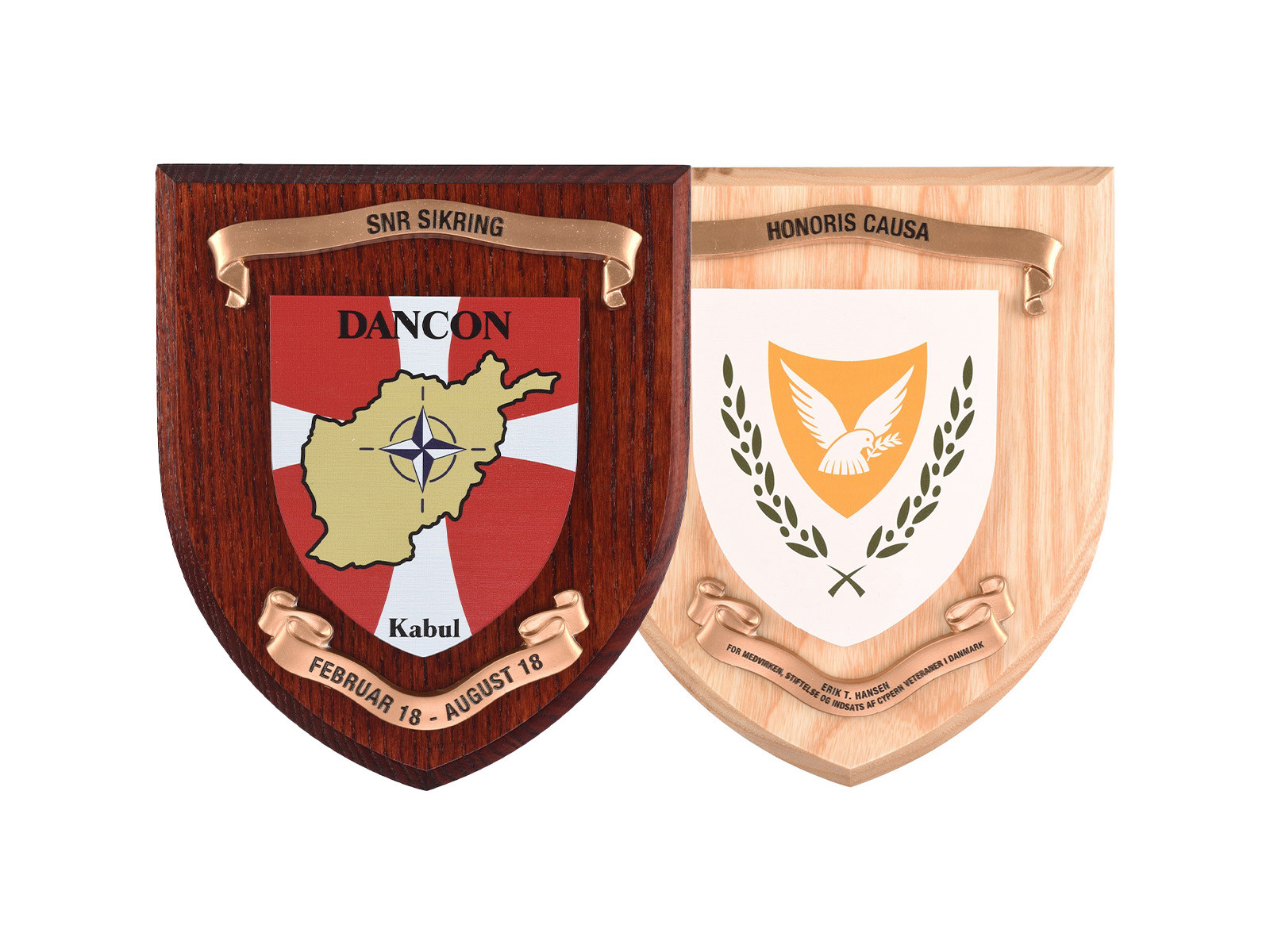 Skjoldet findes i 2 varianter. Et i mørkt træ og et i lyst træ. Den mørke farve passer særligt godt til gyldne farver og giver skjoldet et klassisk look. Den lyse farve giver skjoldet et særligt look og passer særdeles godt til våbenskjolde med mange lyse farver.