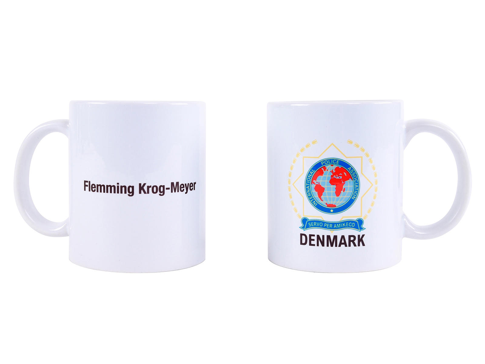 Klassisk hvidt kaffekrus med en praktisk hank; der gør kruset behageligt at drikke af. å den ene side af kruset er trykt International Police Assocation logo; og å den anden side er det muligt at få trykt dit navn; og å denne måde personliggøre kruset.