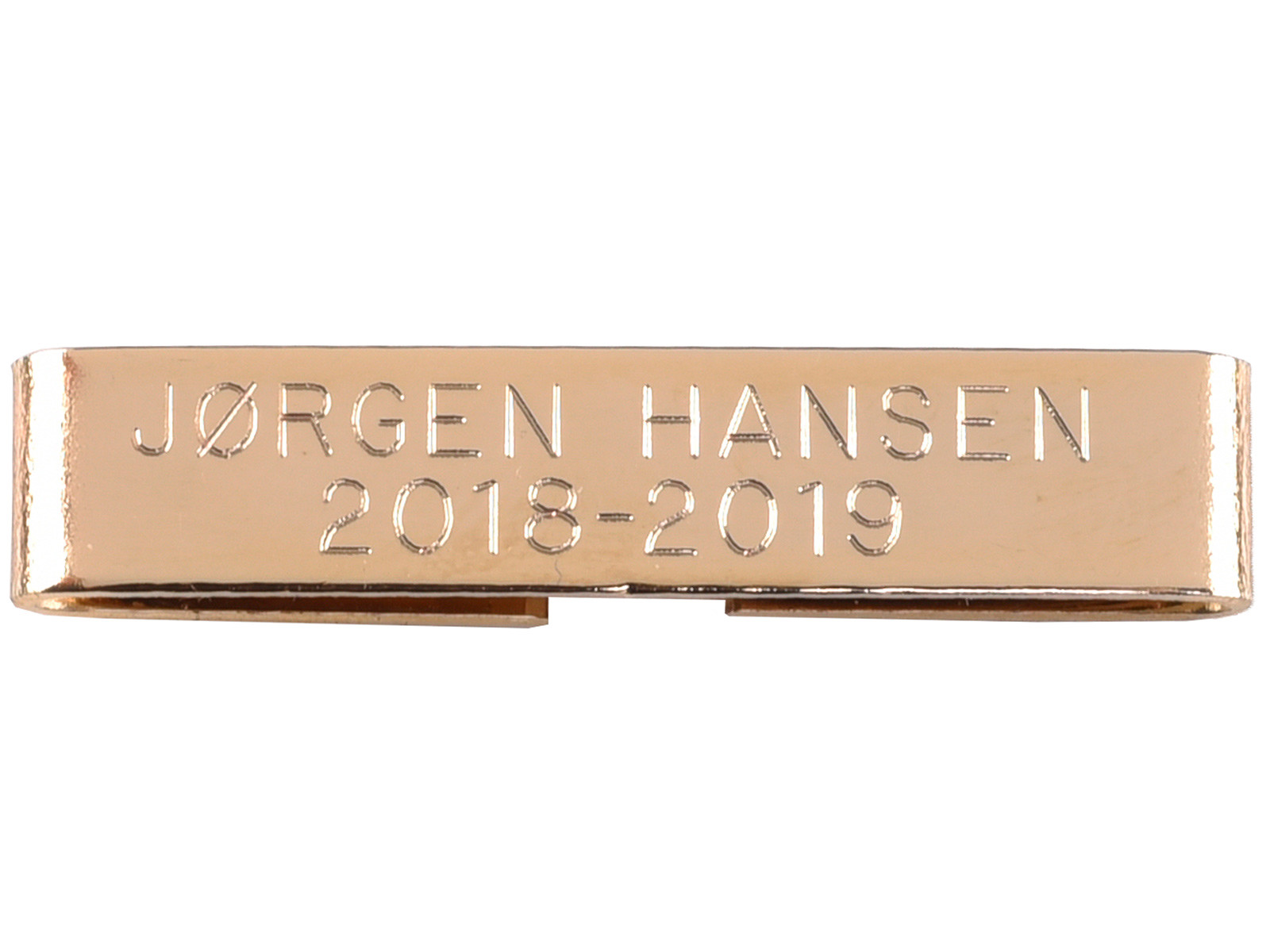 7 x 30 mm navnebjælke med ombuk. Prisen er inklusiv gravering i 2 linjer. For at få graveret; vælg da blot gravering i menuen til højre her å siden. Efterfølgende bedes du angive det ønskede navn i feltet under menuen.