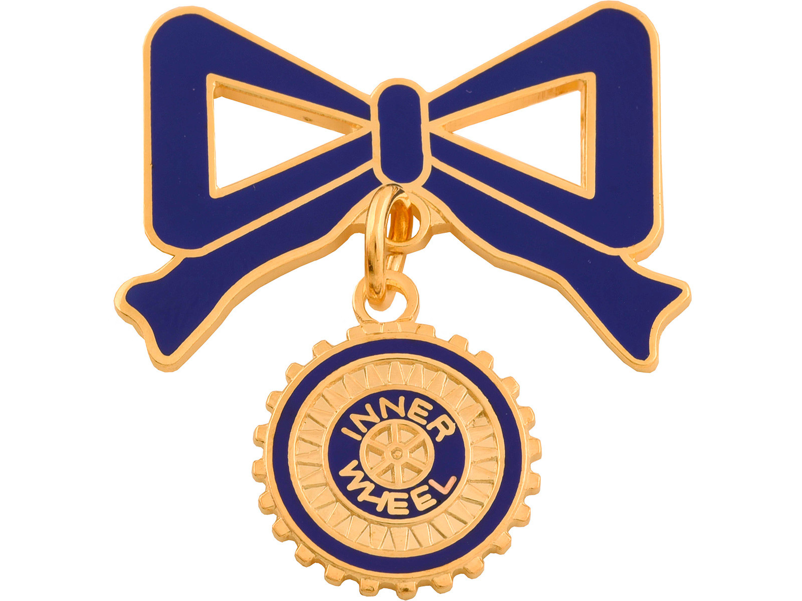 Emblem med Inner Wheel på en sløjfe. Embelm og sløjfe er forgyldt, og har begge en emalje i foreningens flotte blå farve. Denne pin måler 14 mm og er sat på en brochenål.