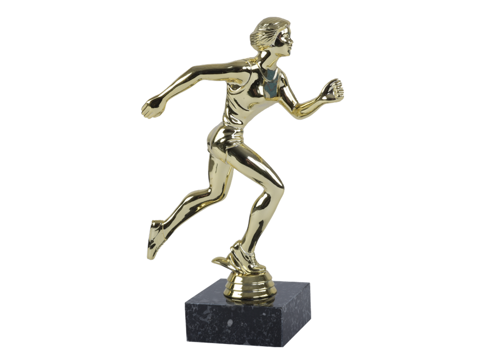 Flot forgyldt løber på en mørk marmorsokkel. Denne figur forestiller en kvindelig løber og er den ideelle præmie til næste løb – f.eks. 5 kilometer, 10 kilometer, terrænløb m.m.