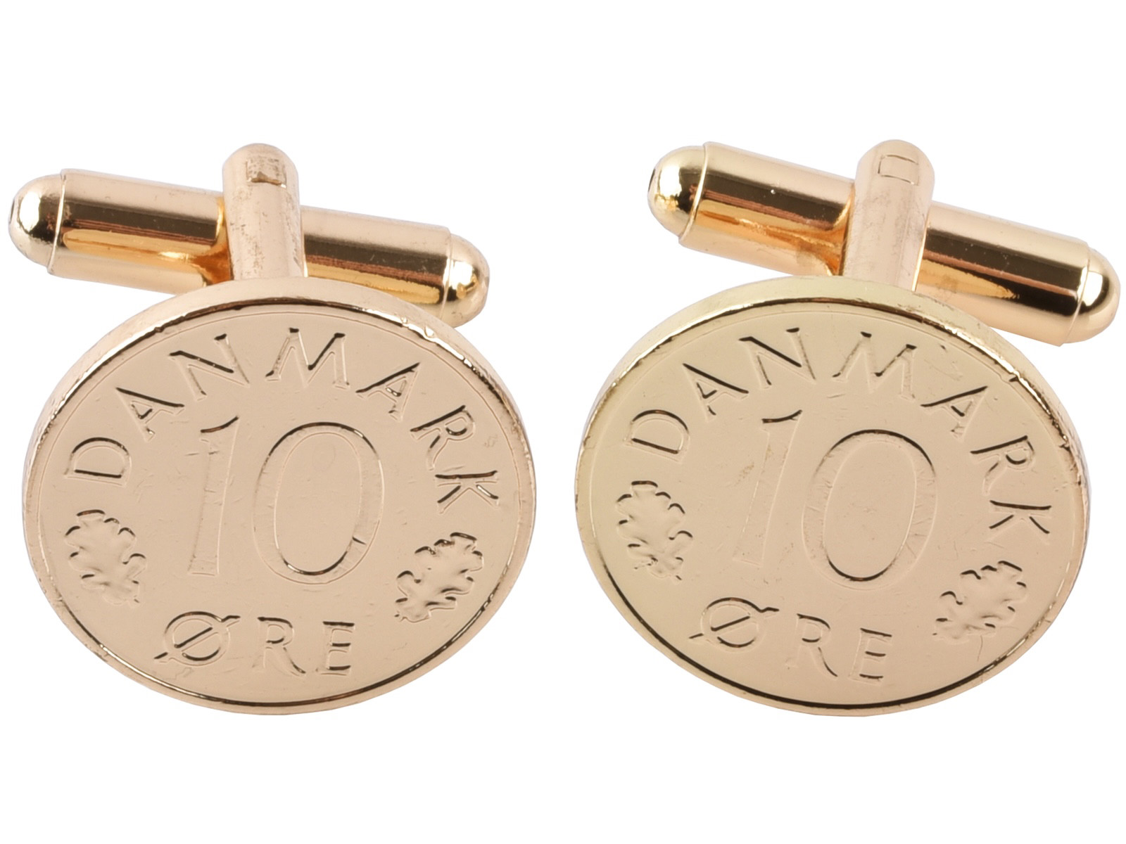Få eller giv et sæt unikke manchetknapper fremstillet af gamle udgåede 10-ører. Hver 10-øre er blevet forgyldt med 24 karat guld, hvilket gør hvert sæt unik.