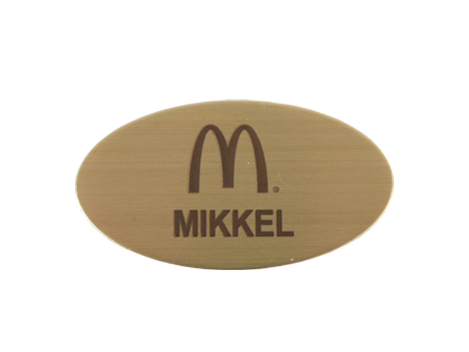 Oval navneskilt i messing m. sikkerhedsnål bagpå.