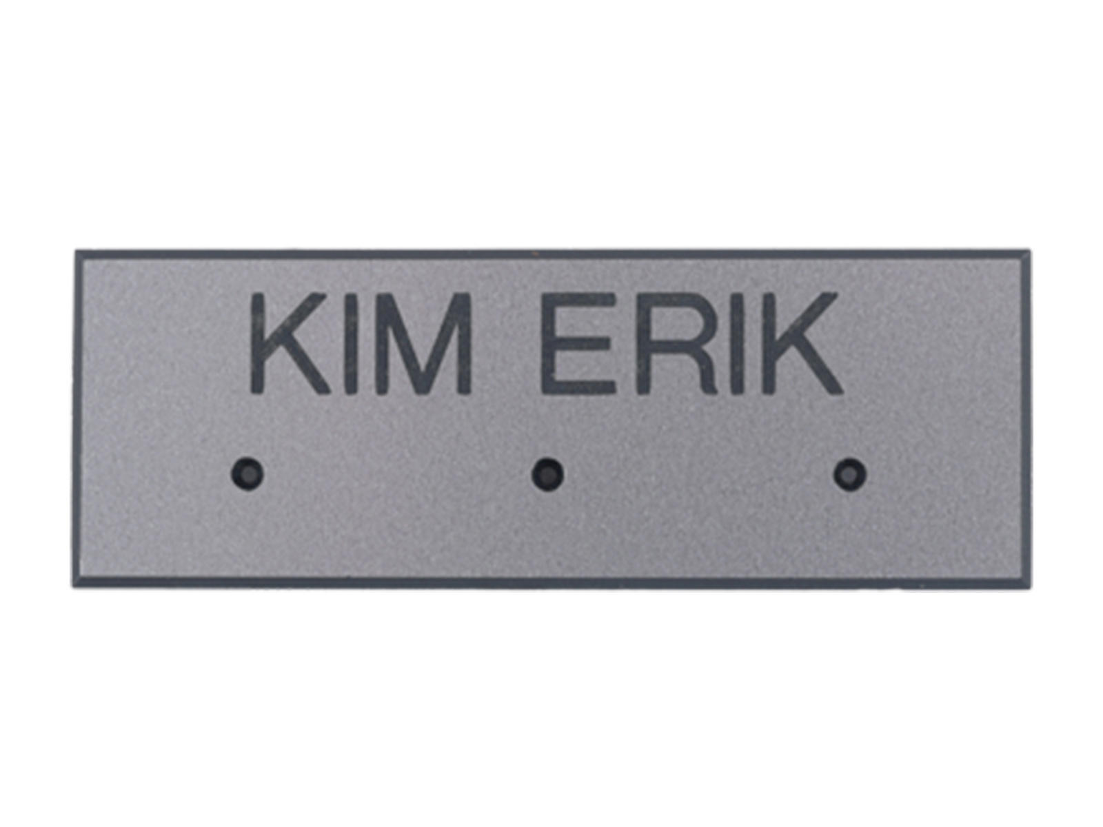 Navneskilt i resopal m. tre huller til pins. Med sikkerhedsnål bagpå.