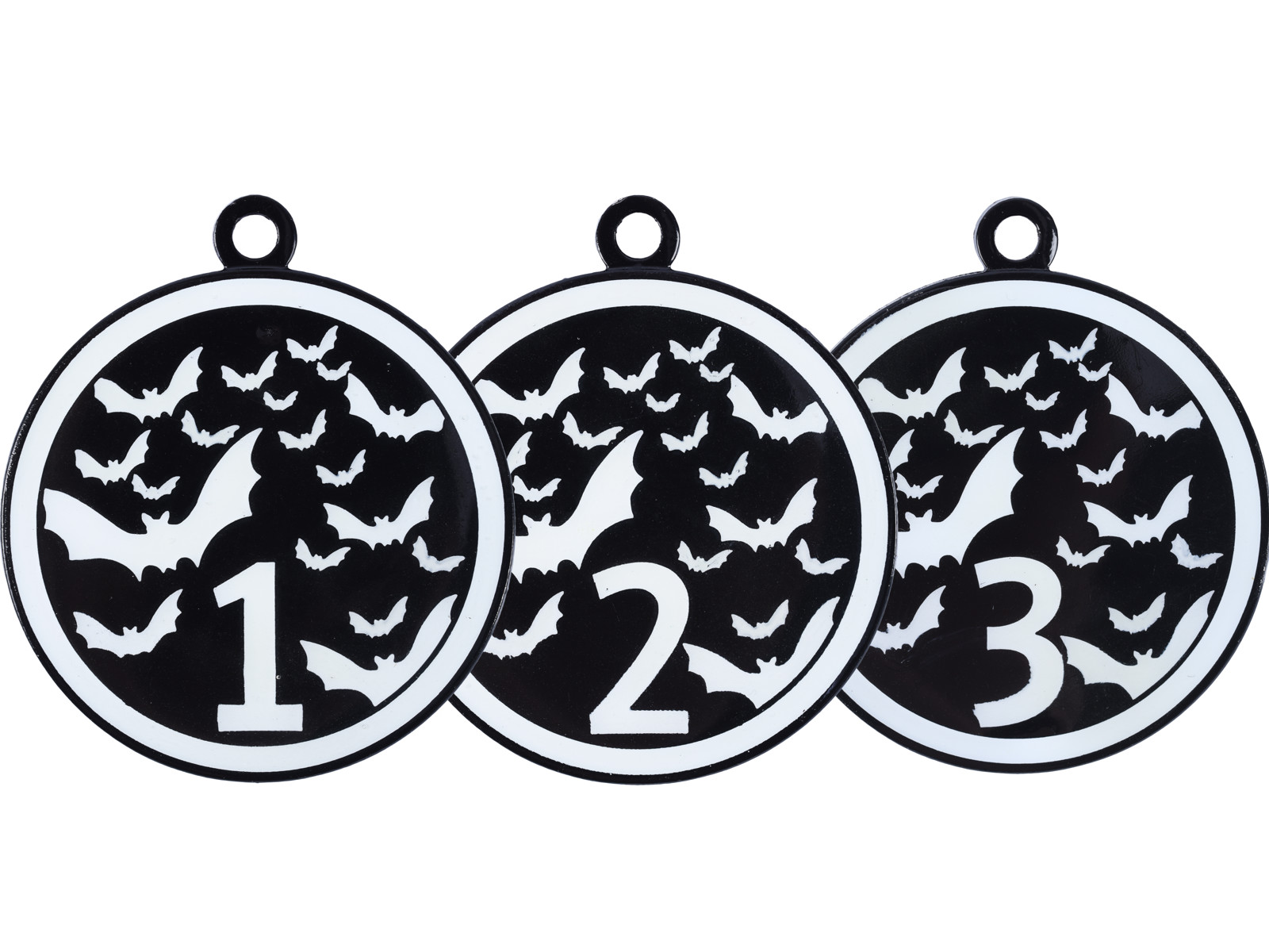 Medaljen er ideel til natløbet eller konkurrencen der slutter ved skumringstid - flagermusene passer perfekt til dette. Den fås ikke i guld, sølv og bronze, men i stedet med tallene 1, 2 og 3. Tallene lyser op ligesom flagermusene og det vil i mørket være nemt at se hvem der har fået 1. pladsen, 2. pladsen og 3. pladsen.