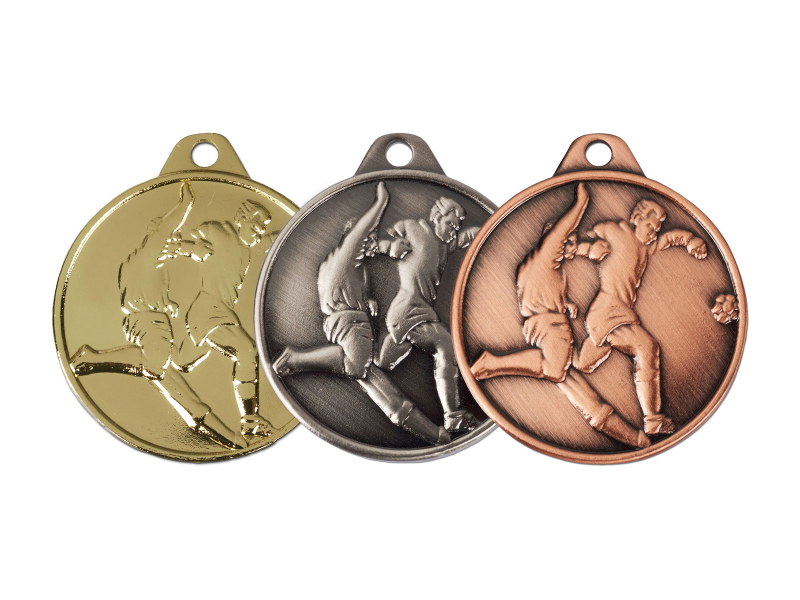 På forsiden af disse medaljer finder du to fodboldspillere i kamp om en fodbold. Medaljen fås i guld, sølv og bronze, hvilket gør den perfekt til stævner med en 1., 2. og 3. plads.