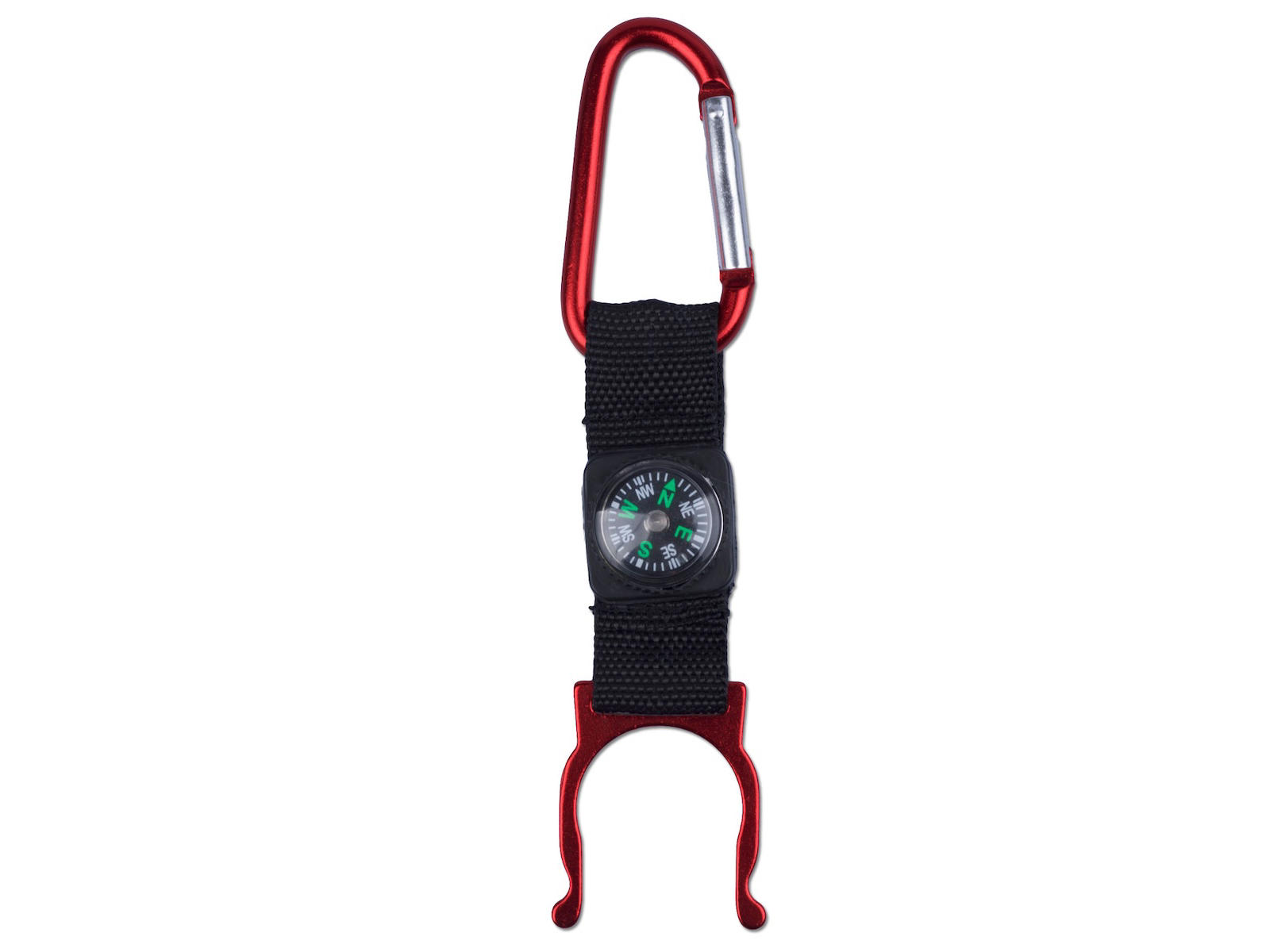 Flaskeholder med røde karabiner og med kompas på stofstykket.