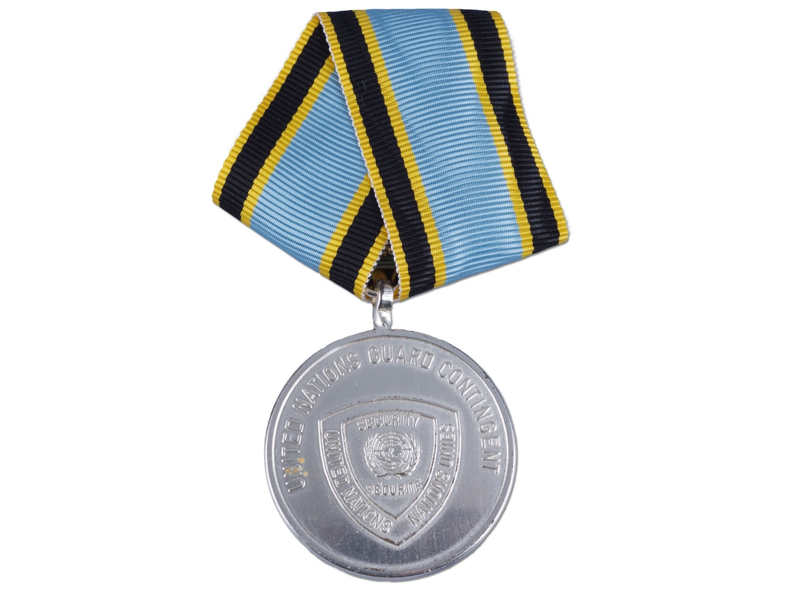 Avers: Øverst står der skrevet ’United Nations Guard Contingent’. Under teksten er et relief af et skjold med samme tekst og UN logoet