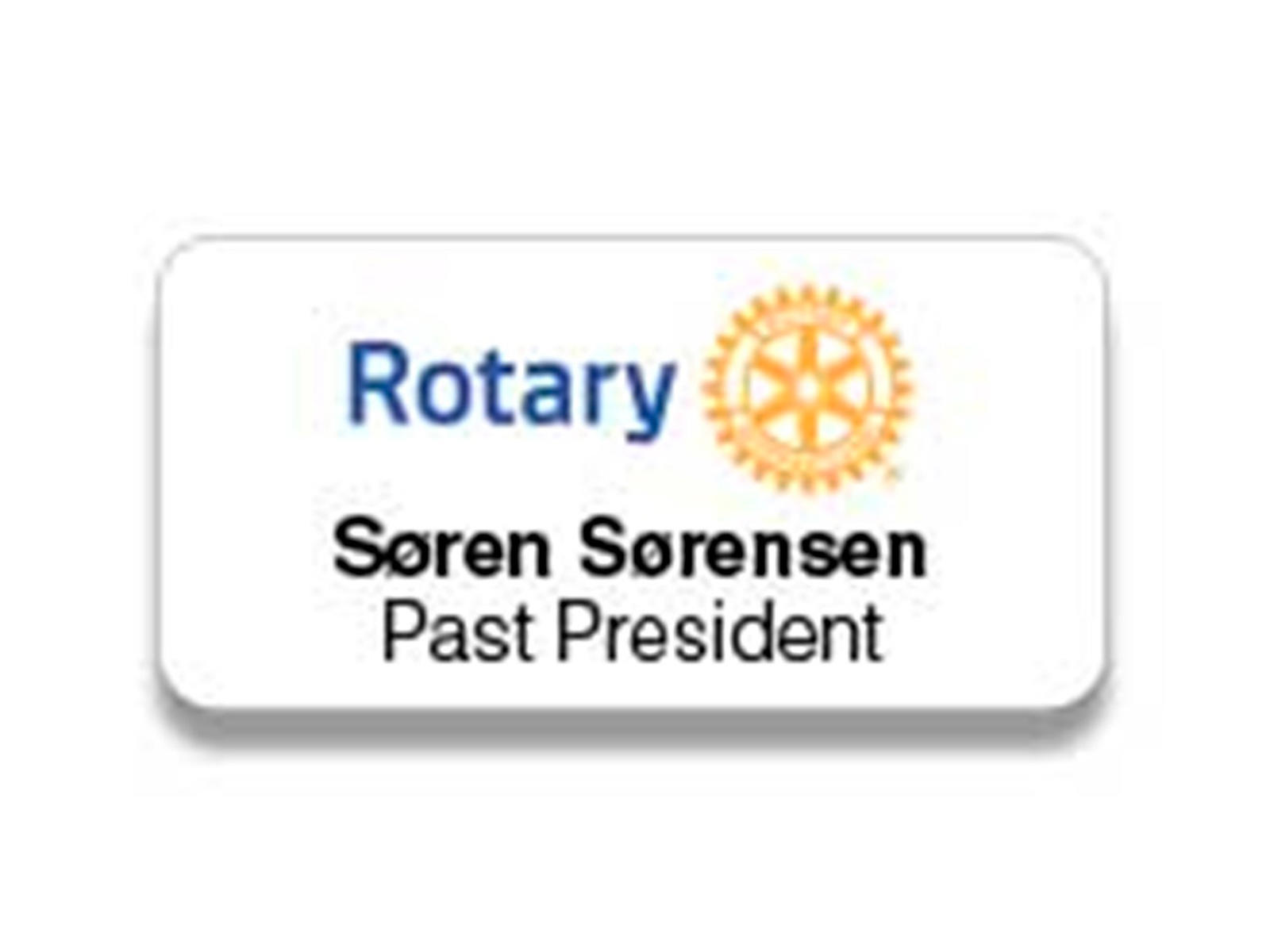 Navneskilt med Rotarys logo i gul og blå. Navneskiltet er hvidt, og navnet vil komme til at stå med sort skrift.