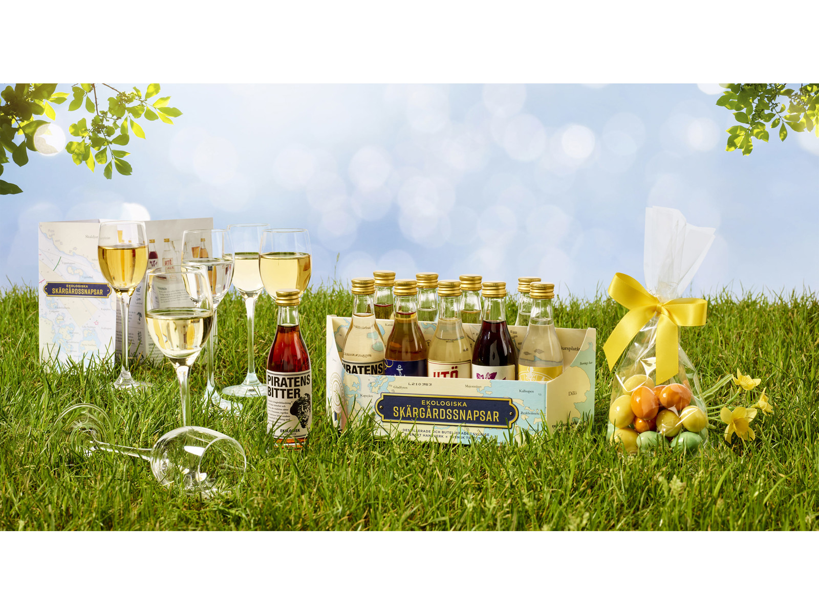 10 økologiske snaps 10x5 cl. - 6 stk. Chef sommelier snapseglas 6x6 cl. Samt 90g. Påskemandler