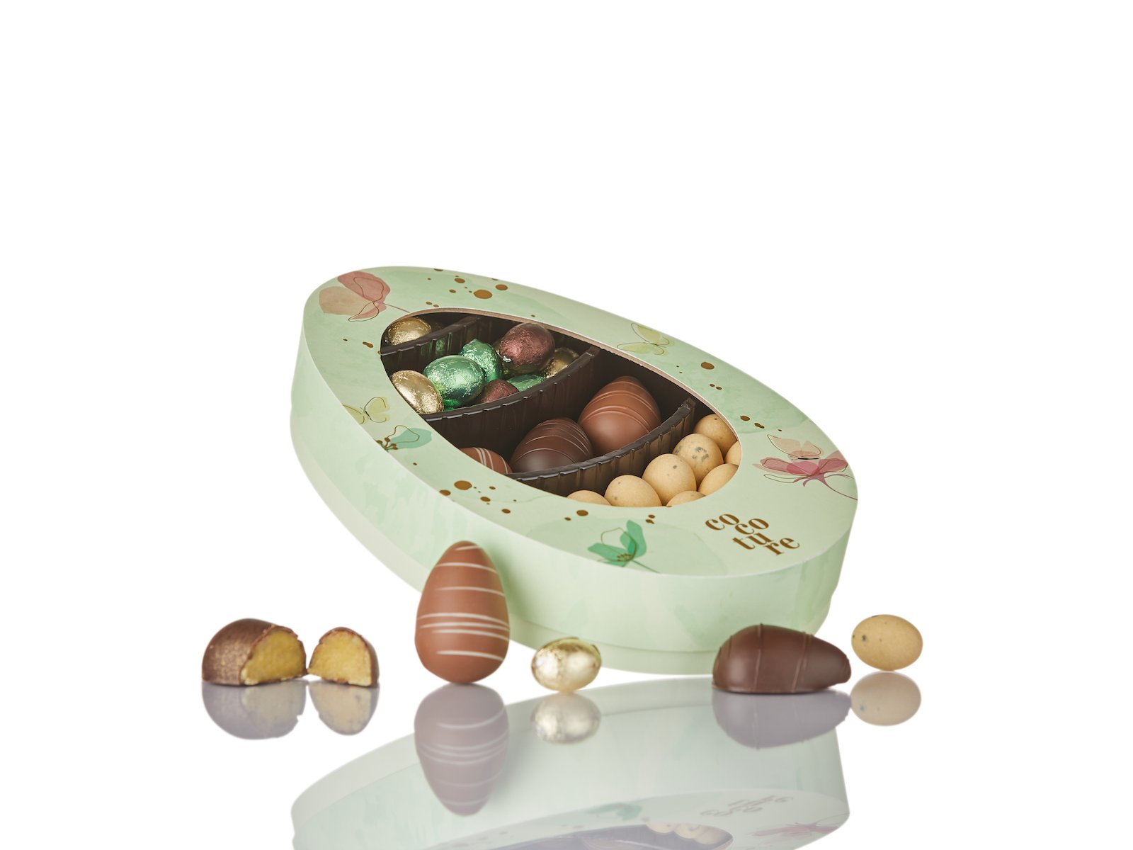 I alt 400g marcipanæg, nye fyldte folieæg ,. brune og hvide drageæg og små drageæg i grøn æske.