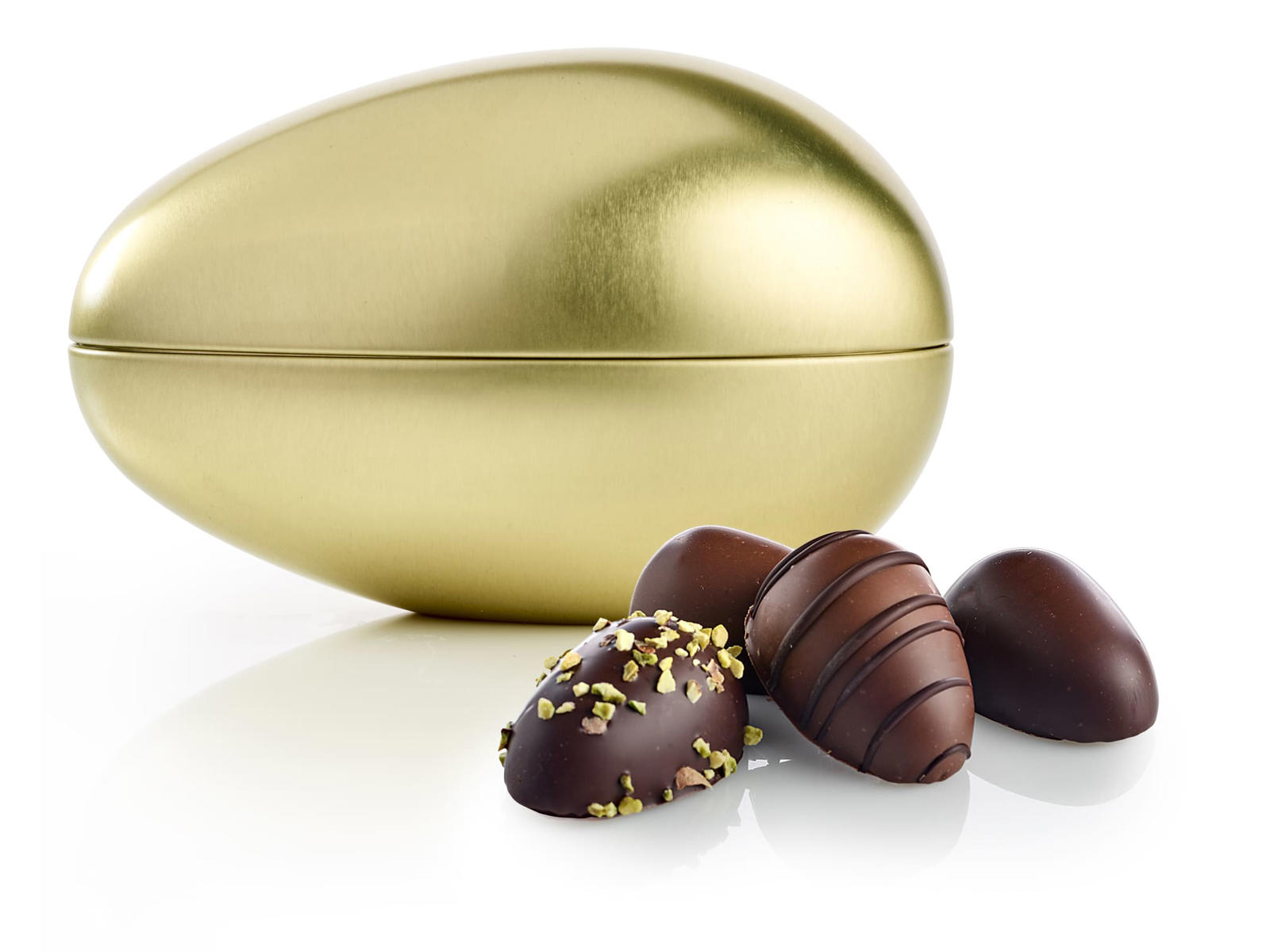 Guld påskeæg str. L:15,5 x B:10,5 x H:9,8 cm. Påskeægget leveres med 140g marcipanæg (7 stk. flowpack)