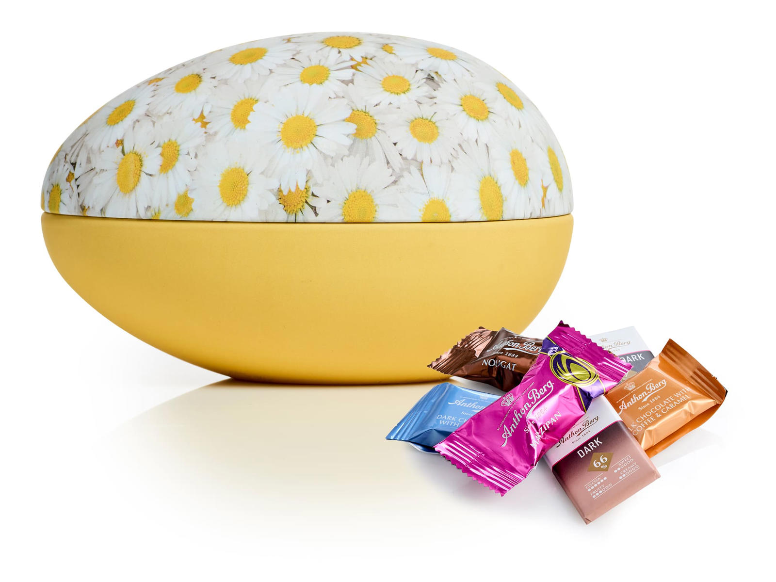 Margurit påskeæg str. L:15,5 x B:10,5 x H:9,8 cm. Påskeægget leveres med 150g. Anthon Berg Mix