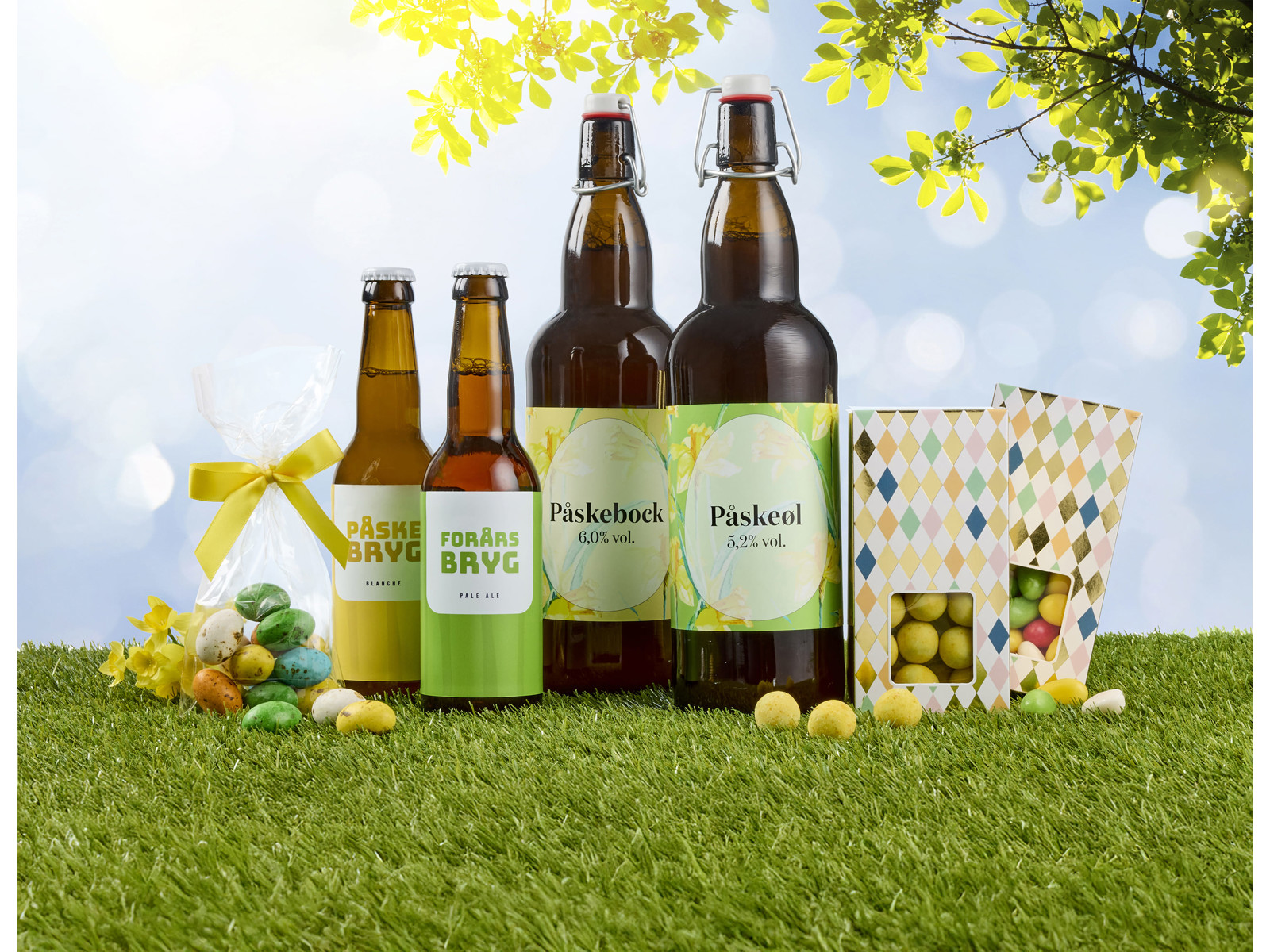Ølpakke med 1 fl. Påskebock 100 cl. 1 fl. Påskeøl 100 cl. 1 fl. Påskebryg 33 cl. 1 fl. Forårsbryg 33 cl. 90g. Sukkeræg, 90g. Lakridskugler m/hvid shokoalde & passion og 90g. Gourmetæg