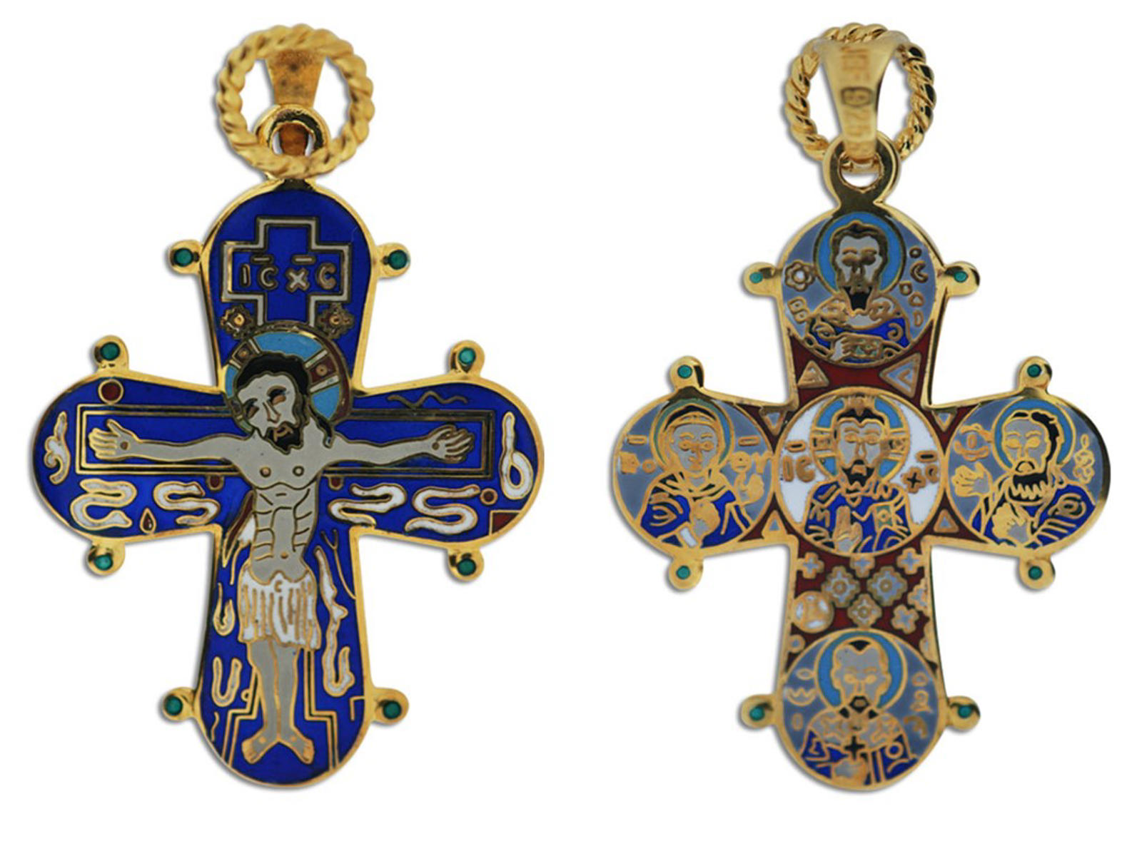 Kristus er afbilledet på korsets forside, og øverst står der med græske bogstaver: "Jesus Kristus".