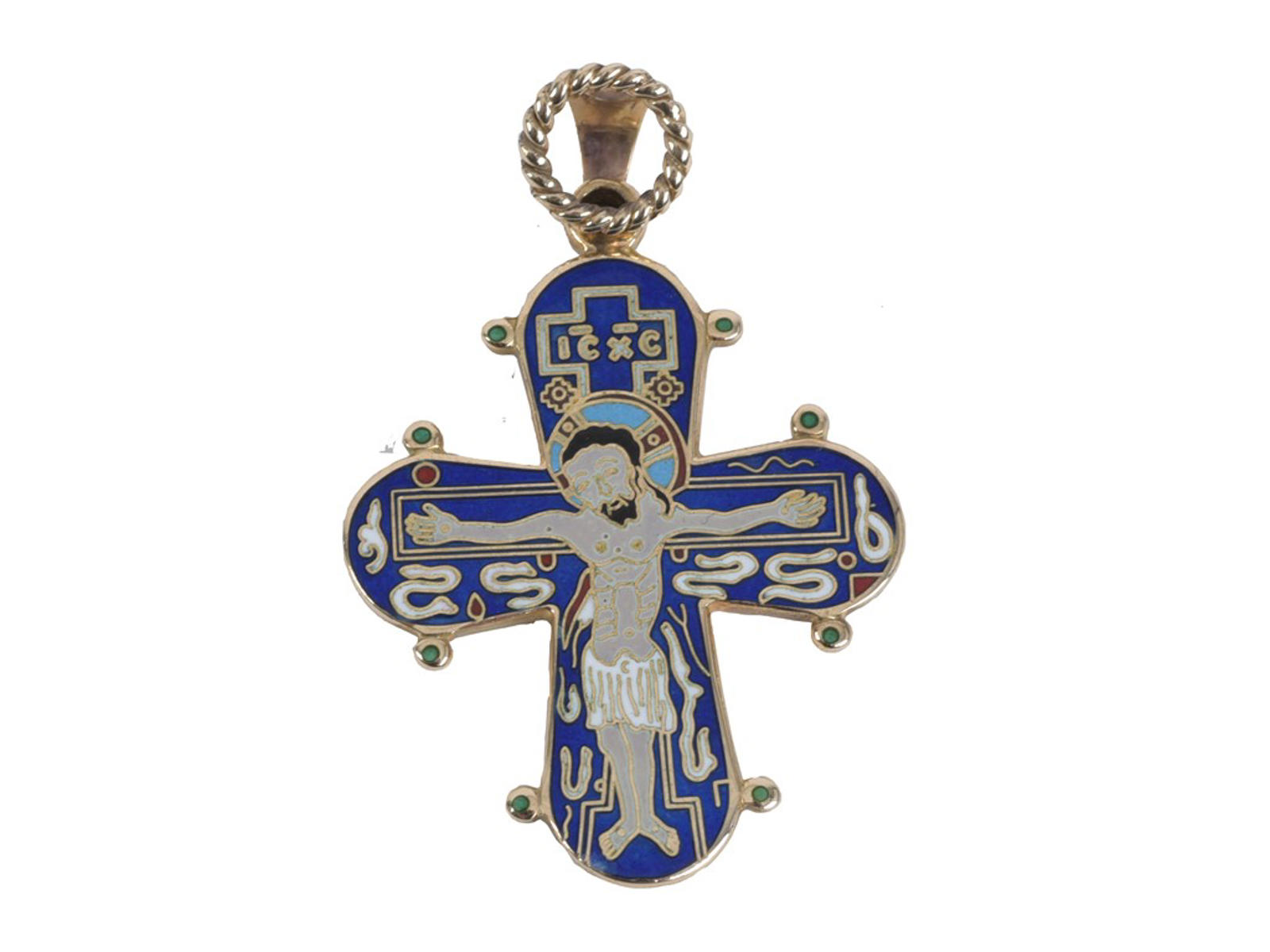 Kristus er afbildet på korsets forside, og øverst står der med græske bogstaver: "Jesus Kristus".