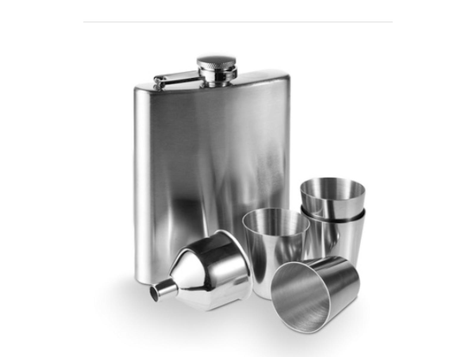 Gavesæt som inkluderer en lommelærke, 4 kopper og en tragt. Flasken kan indeholde 220 ml og kopperne hver især 30 ml. Dette sæt er ideelt at have med på ture, hvor i vil afslutte med en lille drinks.