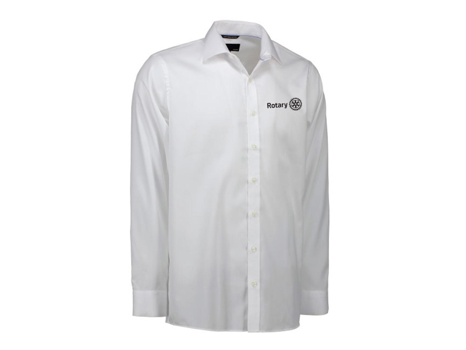 Klassisk hvid skjorte med diskret Rotary logo i sort på brystet. Skjorten fås i flere forskellige størrelser, vælg din ønskede størrelse i menuen til højre her på siden.