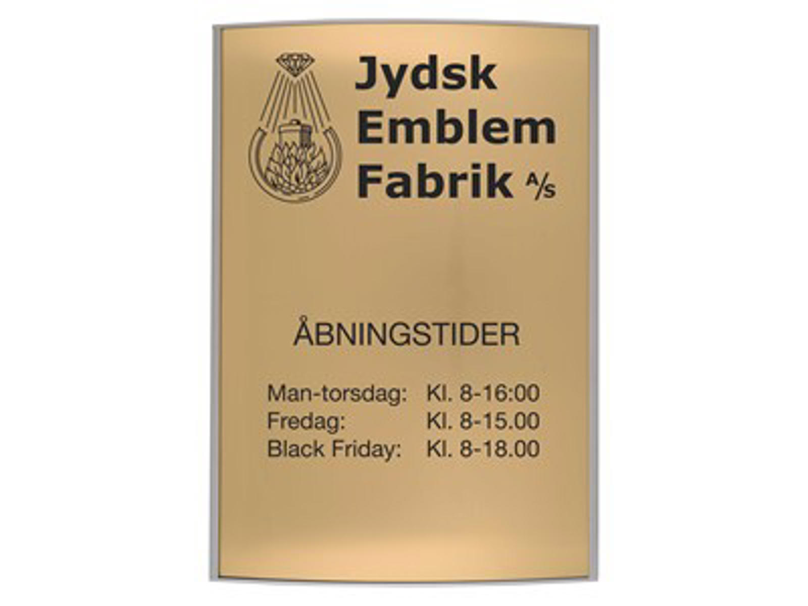 Skiltet er sammensat af en aluminiumsramme; et resopalskilt og et vægbeslag. Aluminiumsrammen buer en smule; hvilket giver skiltet et helt særligt udtryk. Du kan vælge at designe det; så det både kan bruges vertikalt eller horisontalt. Du finder skabeloner længere nede i produktteksten. Vælg mellem guld og sølv resopal i menuen til højre.
