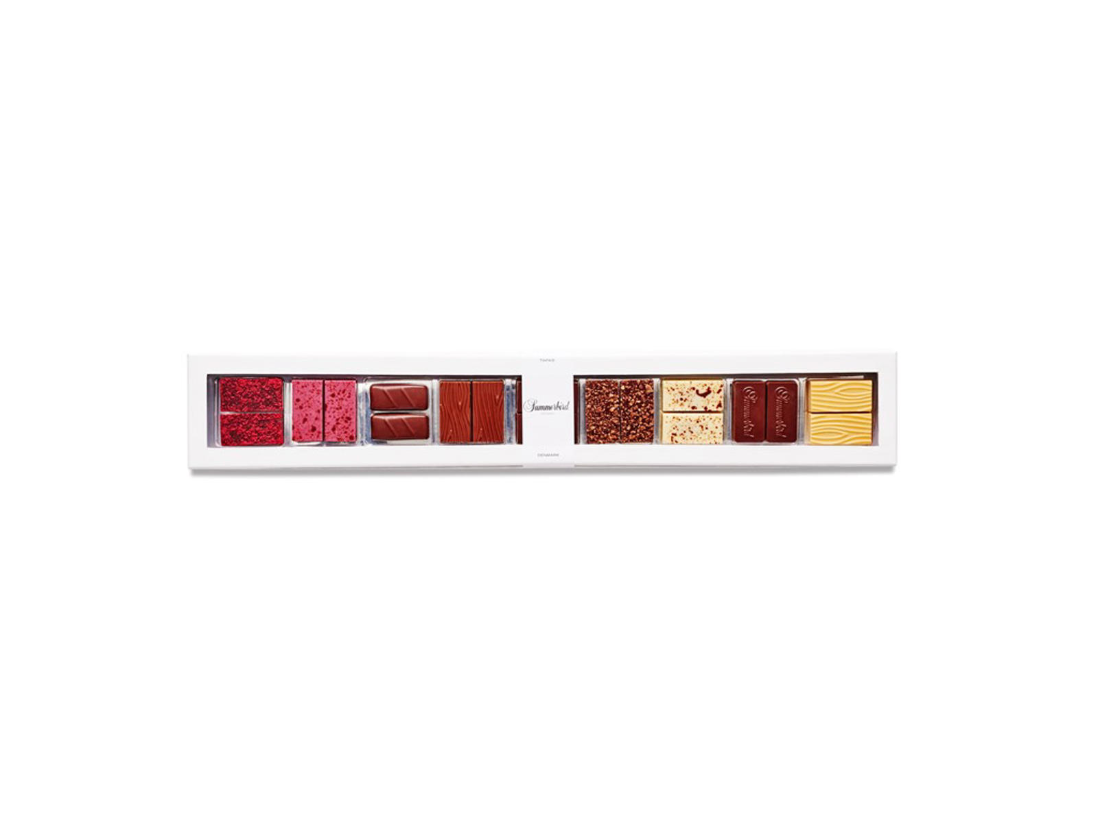 Vores populærere Tapas-gaveæske indeholder en variation over små elegante stykker fyldte chokolader. Æsken byder på en verden af velsmag i form af f.eks. praliné, hindbær, mint eller passion. Ganske enkelt den perfekte æske til dem, som sætter pris på små dekadente smagsoplevelser og harmoni.