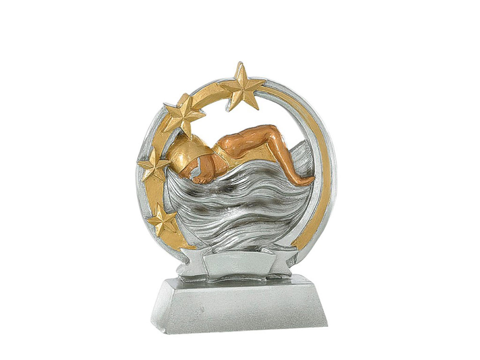 Flot statuette med både guld og sølv farver. På statuetten er der afbilledet en kvindelig svømmer i aktion. Svømmeren er omgivet af stjerner, hvilket giver statuetten lidt ekstra.