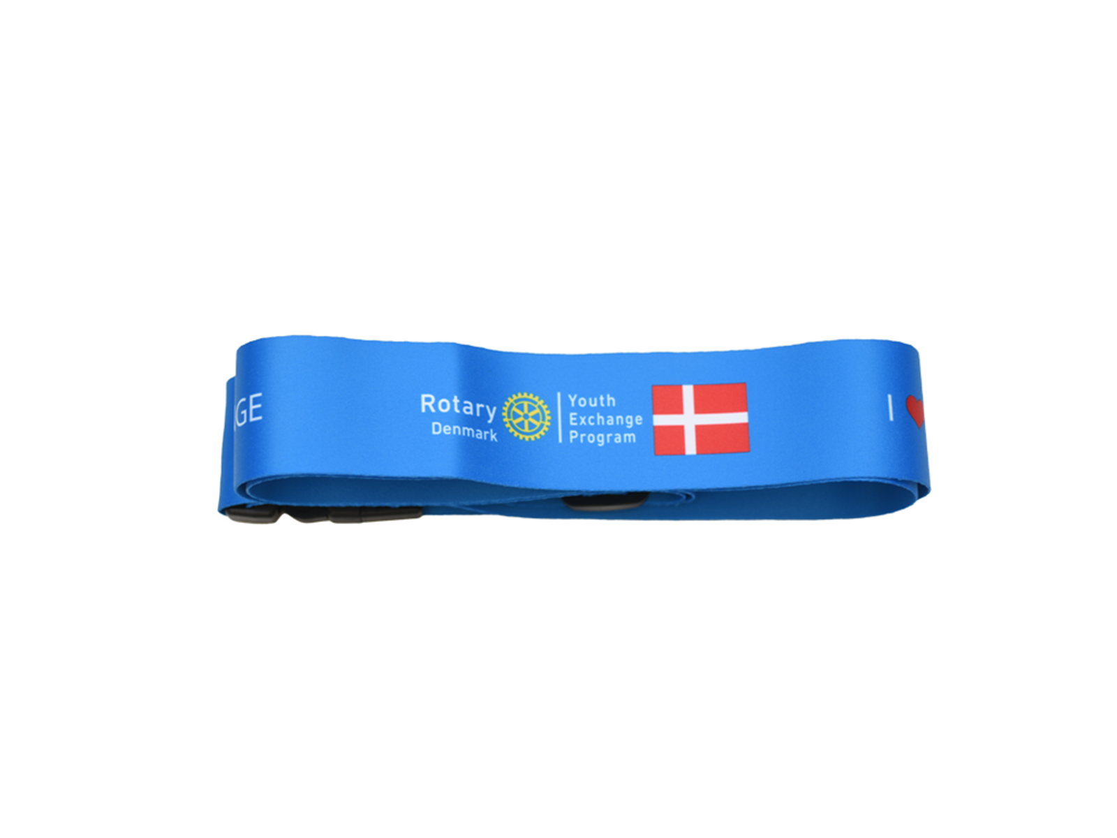 Blåt kuffertbånd med Youth Exchange Program på. Perfekt til dig, der rejser, så du kan spotte din kuffert blandt mængden.