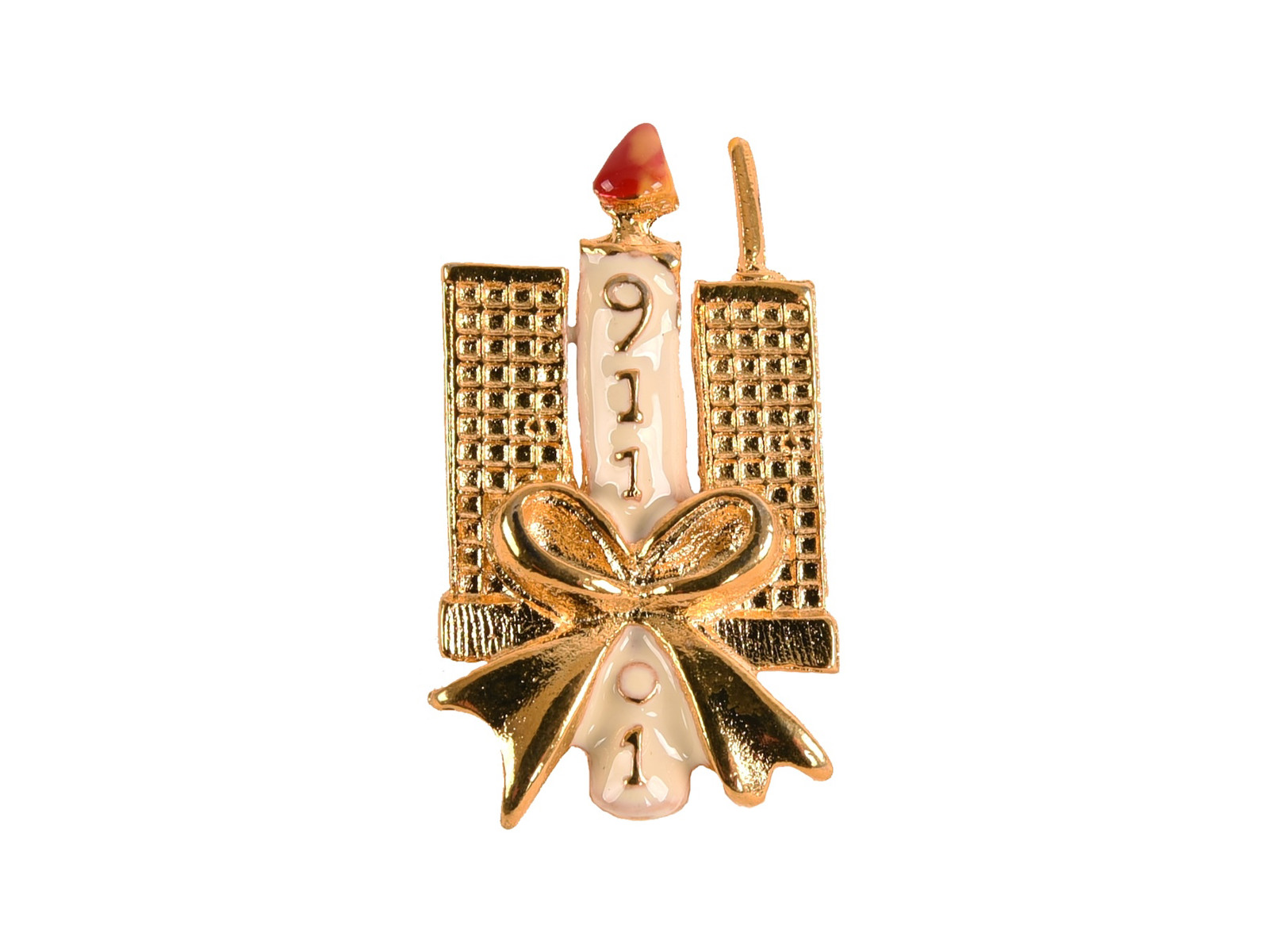 Fin og smuk pin med mange detaljer. Motivet på denne pin er et lys med en sløjfe og skriften "911 01" med en reference til Twin Towers, som er i baggrunden af motivet. På lysets flamme er en fin detalje i rød. Denne pin er i guld og fremstår meget elegant.